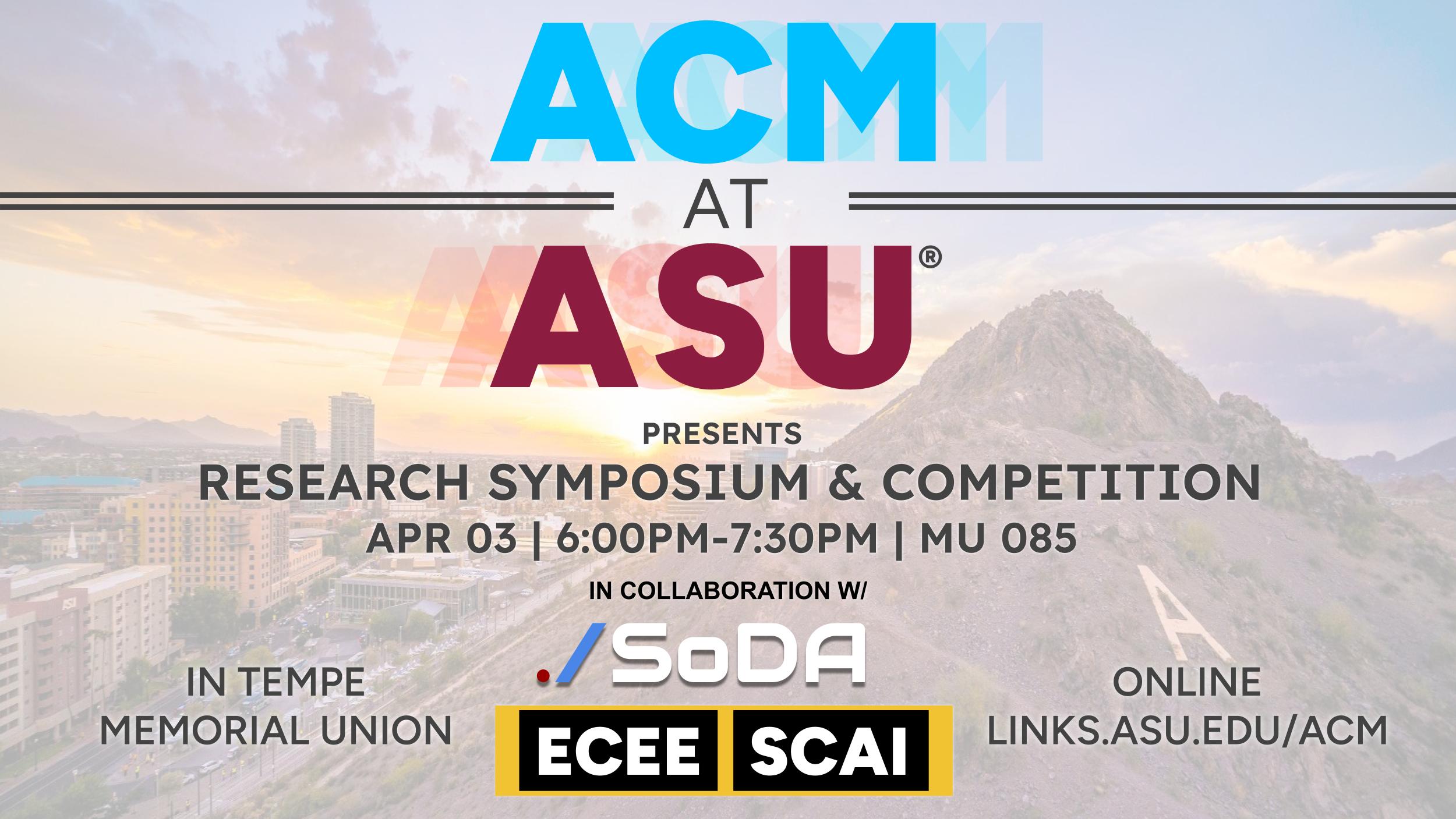 Join us in support of student researchers at the 1st ACM-ASU Research Symposium & Competition. Each contestant receives feedback and a score on their research presentations from a panel of experienced researchers from SCAI and ECEE.